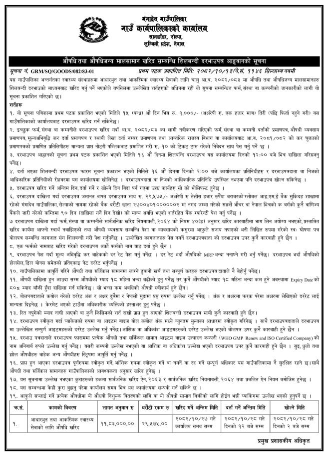 औषधि तथा औषधिजन्य मालसामान खरिद सम्बन्धि शिलबन्दी दरभाउपत्र आहृवानको सूचना