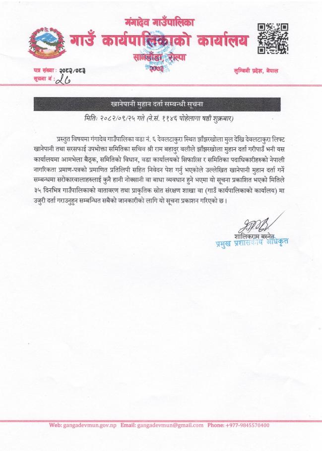 खानेपानी मुहान(झाँझरखोला) दर्ता सम्बन्धि सूचना