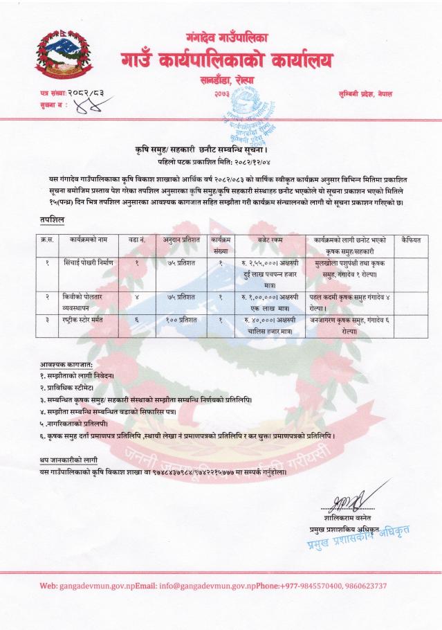कृषि समुह/सहकारी छनौट सम्बन्धि सूचना
