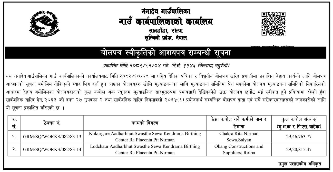 बोलपत्र स्वीकृतिको आशयपत्र सम्बन्धि सूचना